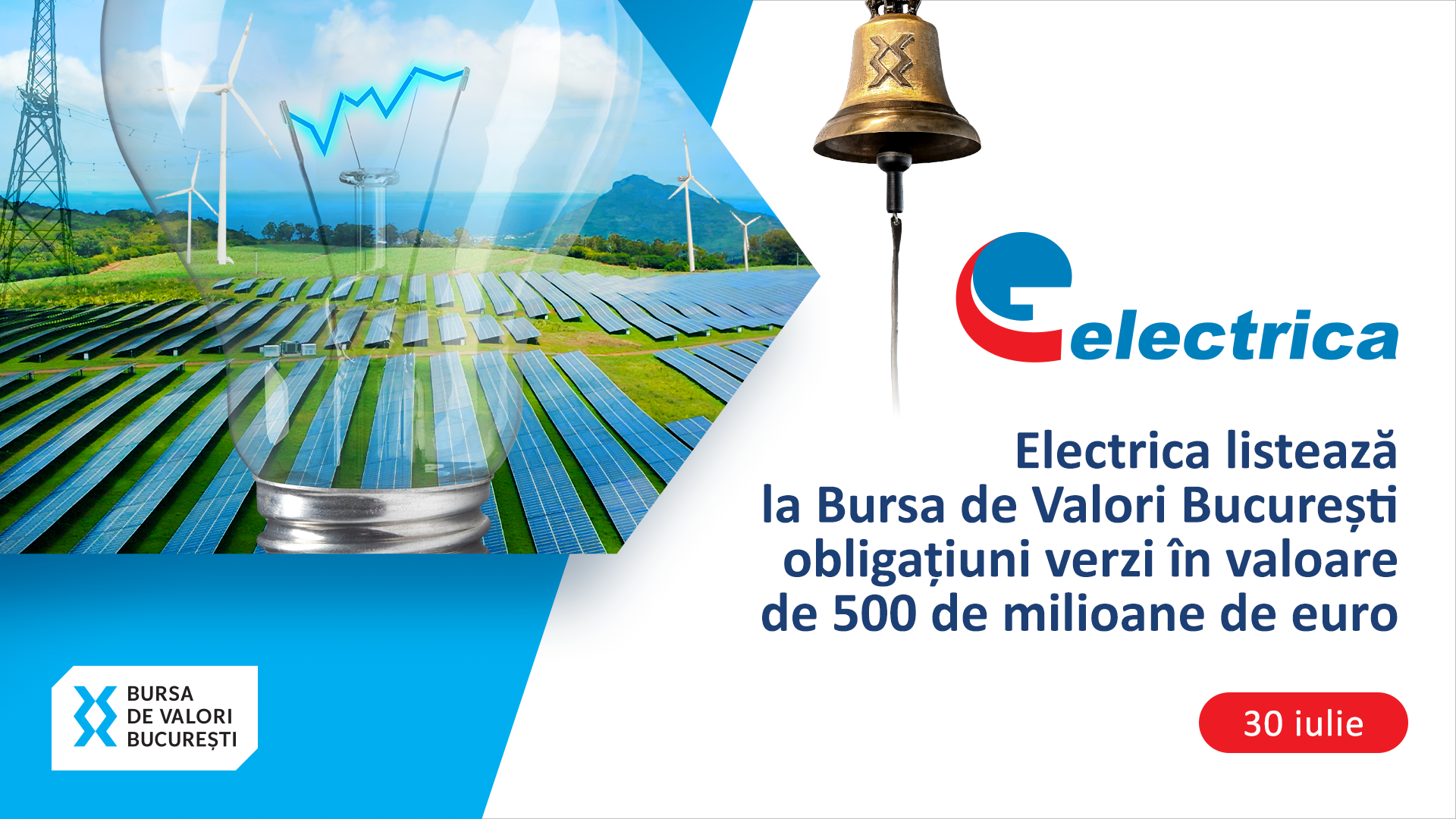 Bursa de Valori Bucuresti si Electrica (simbol bursier: EL), unul dintre cei mai importanti actori pe piata de distributie, furnizare si productie a energiei electrice din Romania, va invita sa urmariti miercuri, 30 iulie, de la ora 10:00, evenimentul care marcheaza intrarea la tranzactionare a primei emisiuni de obligatiuni a companiei Electrica.
